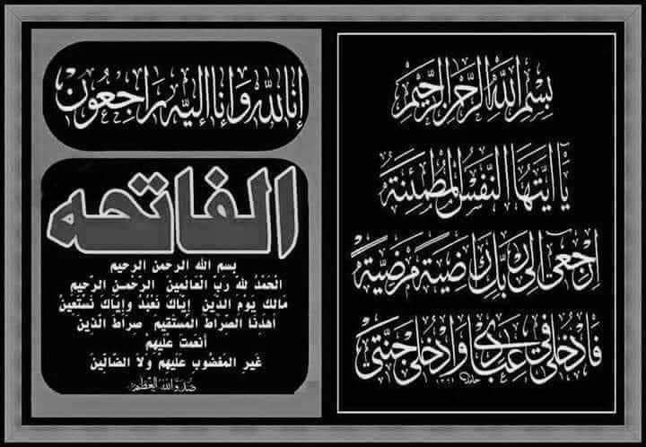 قال تعالي((يَا أَيَّتُهَا النَّفْسُ الْمُطْمَئِنَّةُ ارْجِعِي إِلَىٰ رَبِّكِ رَاضِيَةً مَّرْضِيَّةً فَادْخُلِي فِي عِبَادِي وَادْخُلِي جَنَّتِي )).بقلوب مؤمنة بقضاء الله وقدره وببالغ الحزن والاسى تلقينا نباء وفاة ...