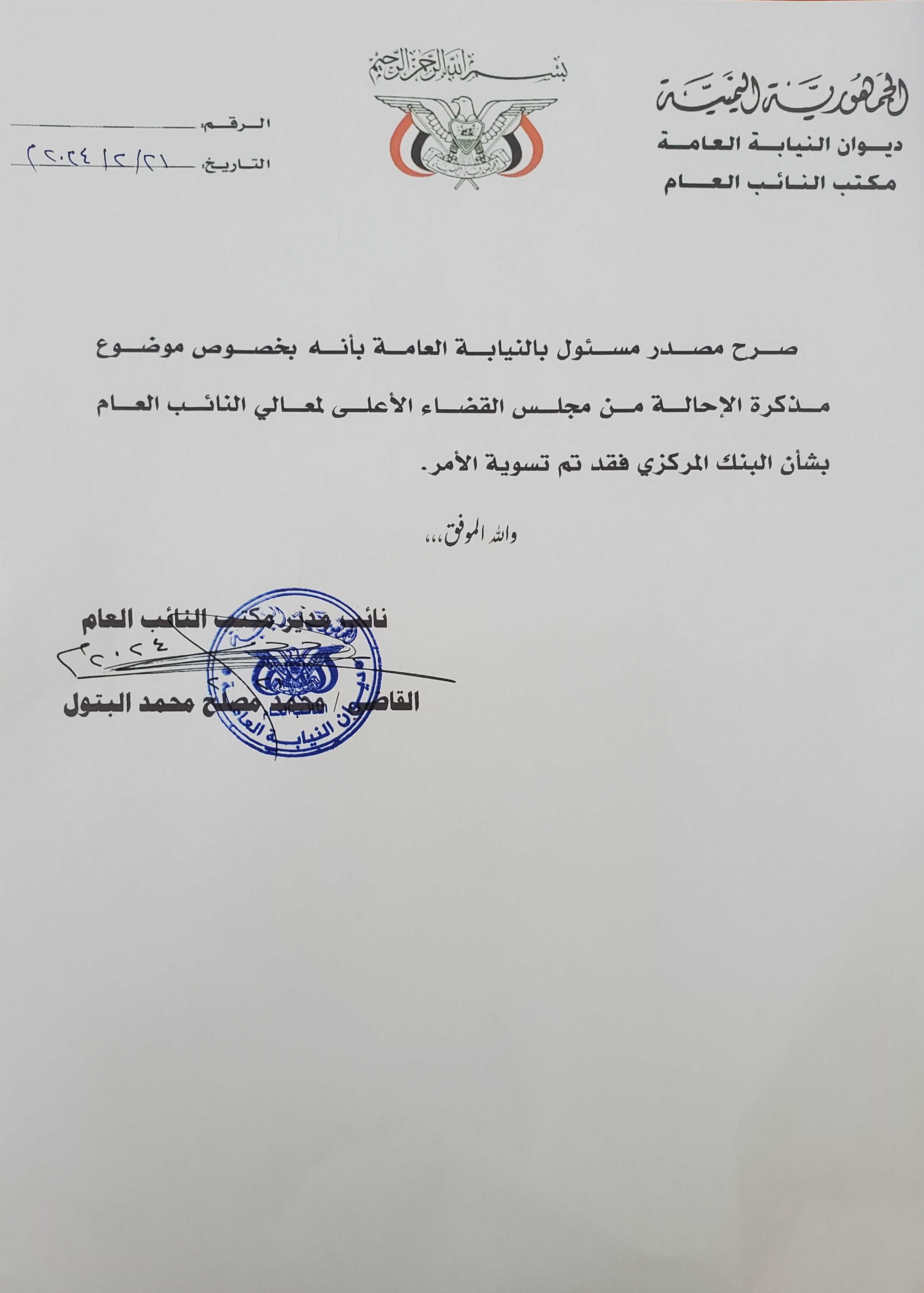صرح مصدر مسؤول بالنيابة العامة بإنه بخصوص مذكرة الاحالة من مجلس القضاء الاعلى لمعالي النائب العام بشأن البنك المركزي انه تم تسوية الأمر. ...