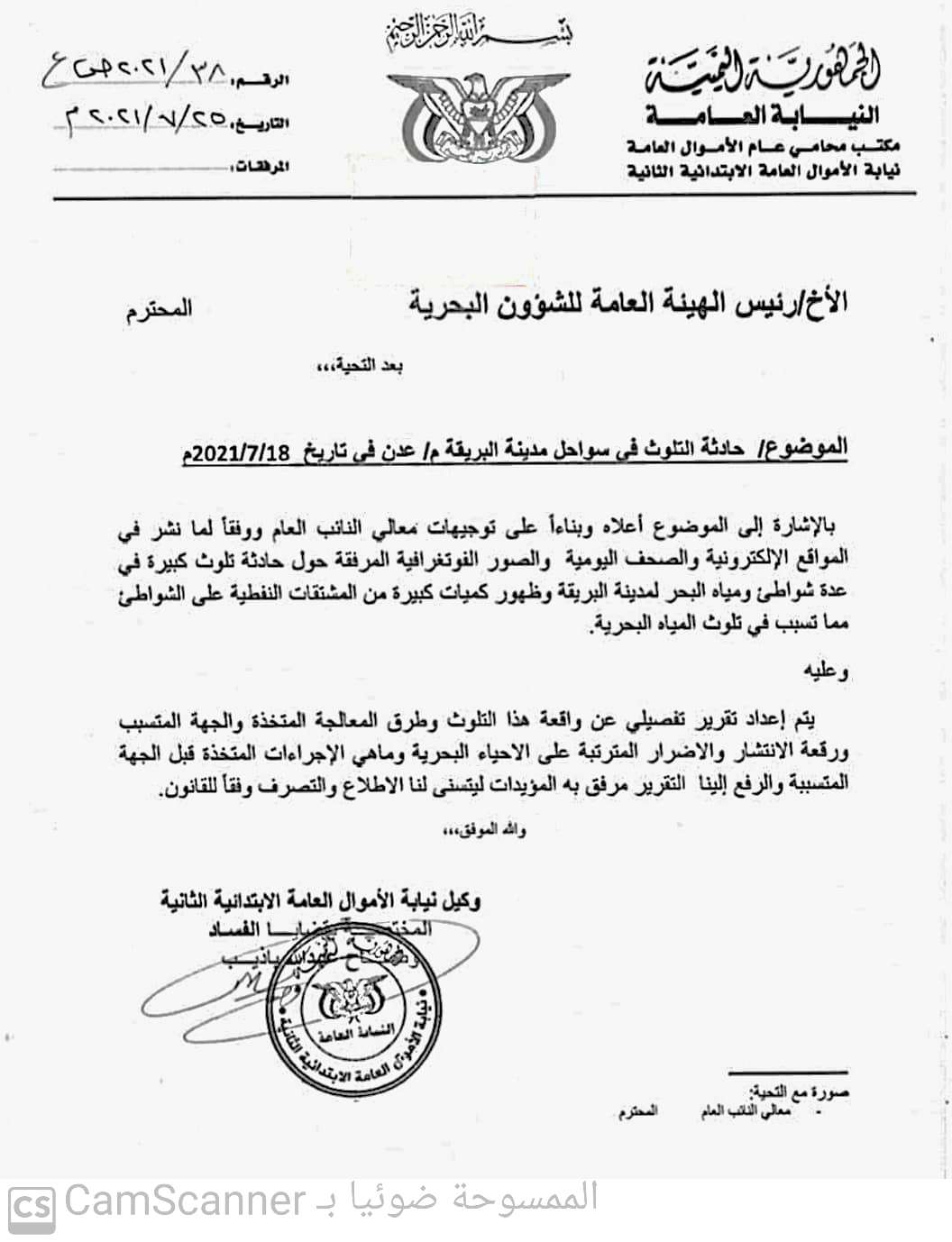 وجهت النيابة العامة رئيس الهيئة العامة للشئون البحرية بالعاصمة المؤقتة عدن بإعداد تقرير تفصيلي حول حادثة التلوث في سواحل مدينة البريقة وطرق المعالجة والجهة المتسببة ورقعة الانتشار والاضرار المترتبة على الاحياء البحري ...